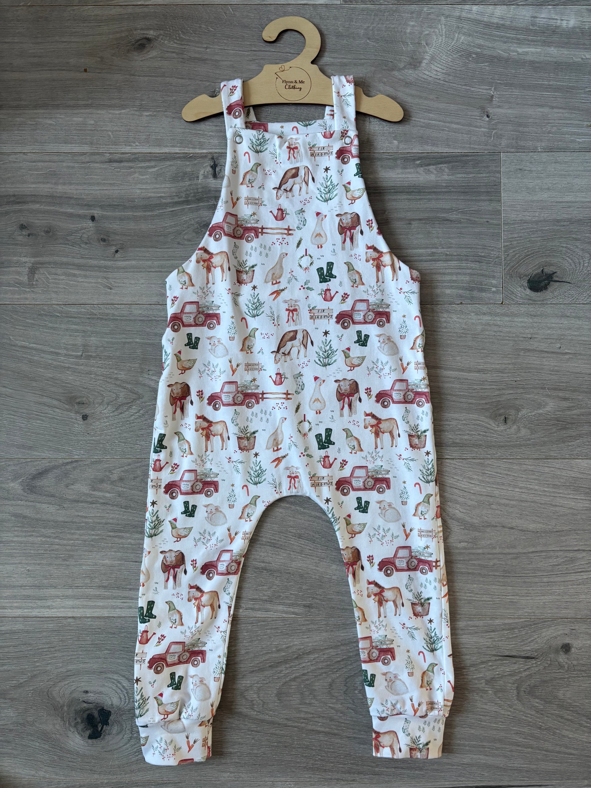 Treat yourself to a pair of dungarees in Christmas On Ralph’s Farm which is full of rustic charm and festive cheer — featuring tractors carrying trees, playful farm animals in scarves and Santa hats, and cosy countryside touches like wellies, wreaths, and winter greenery. This heartwarming design captures the magic of a countryside Christmas and makes a lovely choice for little ones who love animals and adventure. Ideal for sibling sets or festive family photos, it’s a storybook scene brought to life in soft, muted tones.
