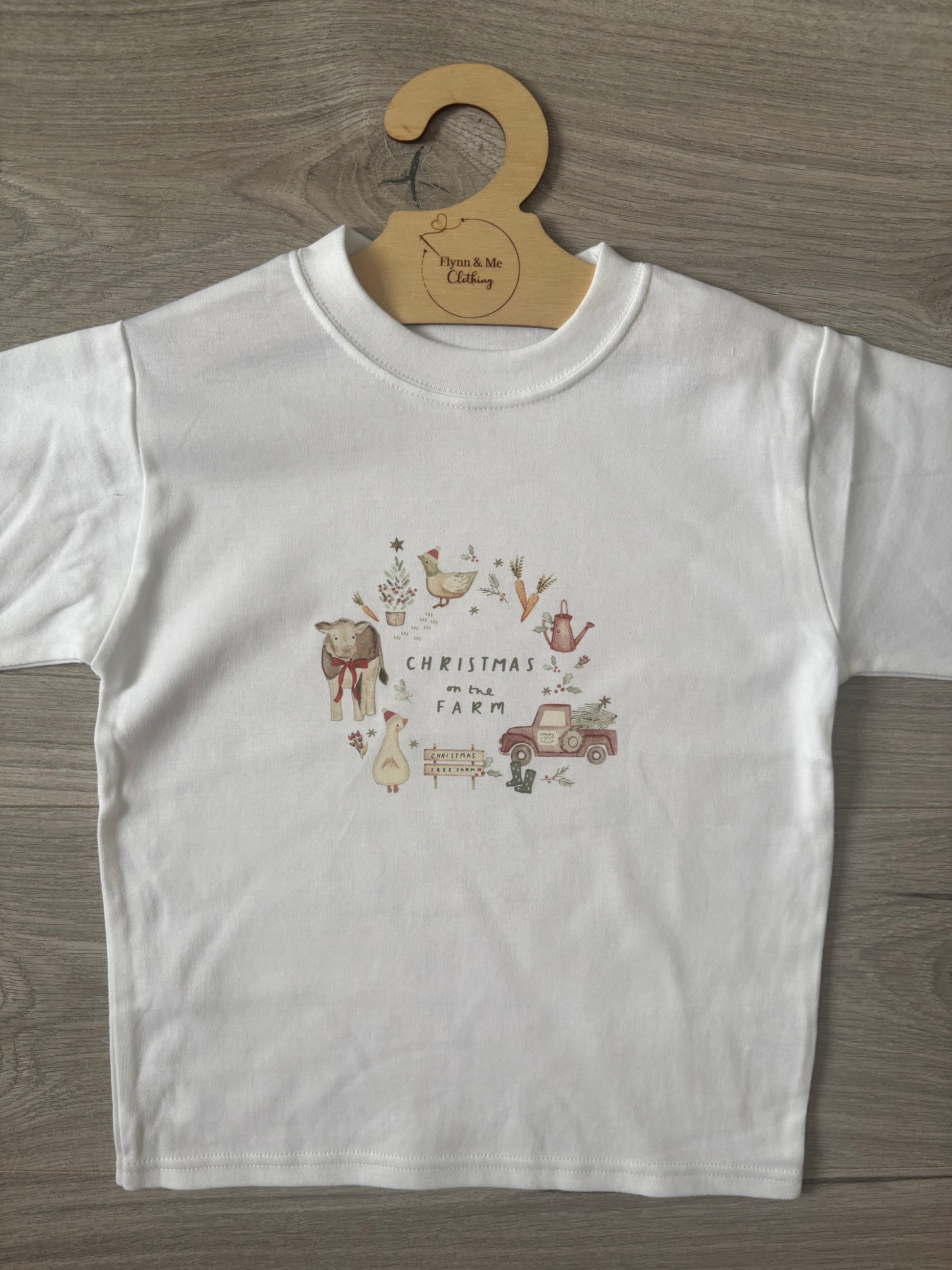 Bring the heart of the countryside to your little one’s festive wardrobe with this charming top, featuring a joyful wreath made up of friendly cows, a classic red farm truck, waddling ducks and geese, and freshly harvested carrots — all encircling the warm message, “Christmas on the Farm.” Perfect for little farm lovers and those who adore rural holiday traditions.
