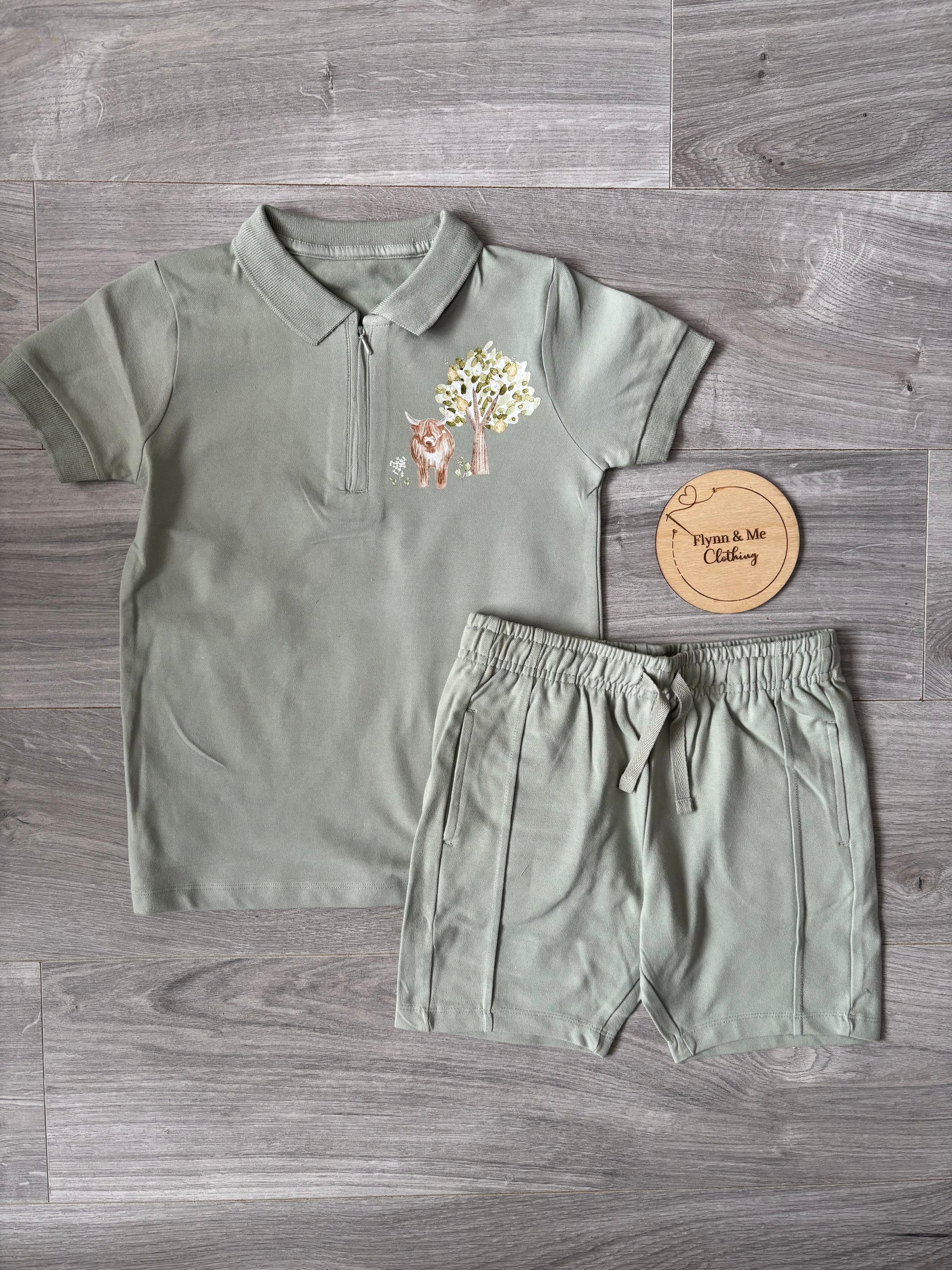 Our sage polo sets are the perfect to wear when exploring the outdoors, or for cozying up in rustic style. The polo top features a central zip (with fabric lining on the reverse) and the shorts include two front pockets and one on the reverse.