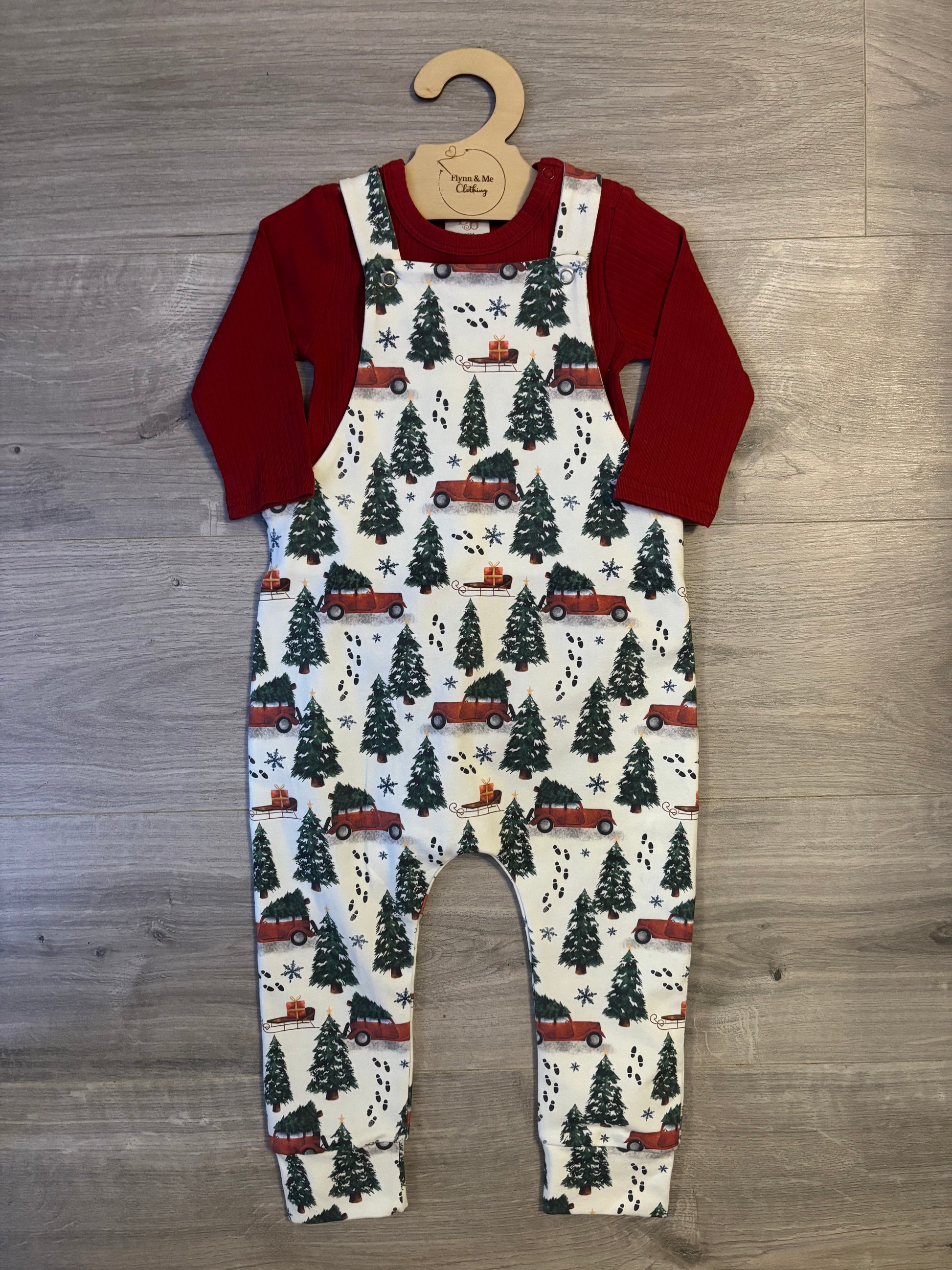 Treat yourself to a pair of dungarees in our true customer favourite - Flynn’s Truck - to your winter, handmade wardrobe. Flynn’s Trucks is our signature festive print, loved year after year for its nostalgic charm. Featuring classic red trucks carrying Christmas trees through a snowy countryside, it captures the joy of simple traditions and the cosy magic of the season — perfect for little ones making festive memories of their own.