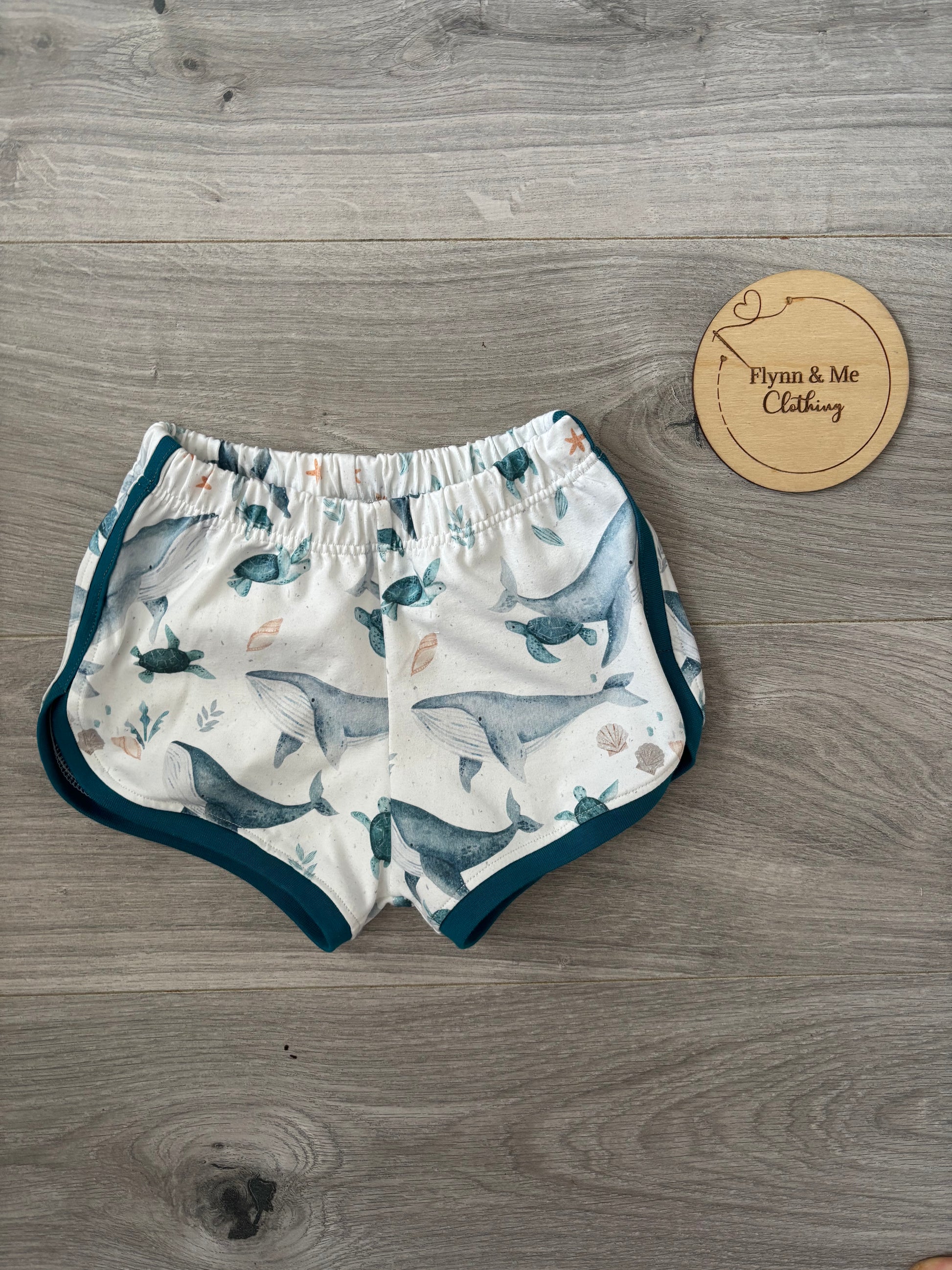 Our retro shorts feature an elasticated waistband and rib detail along the side seams and bottom - complementing the main design with a pop of colour. They are handmade from organic cotton jersey, knitted and printed in the UK using eco-friendly techniques, and are posted to you in eco-friendly packaging.