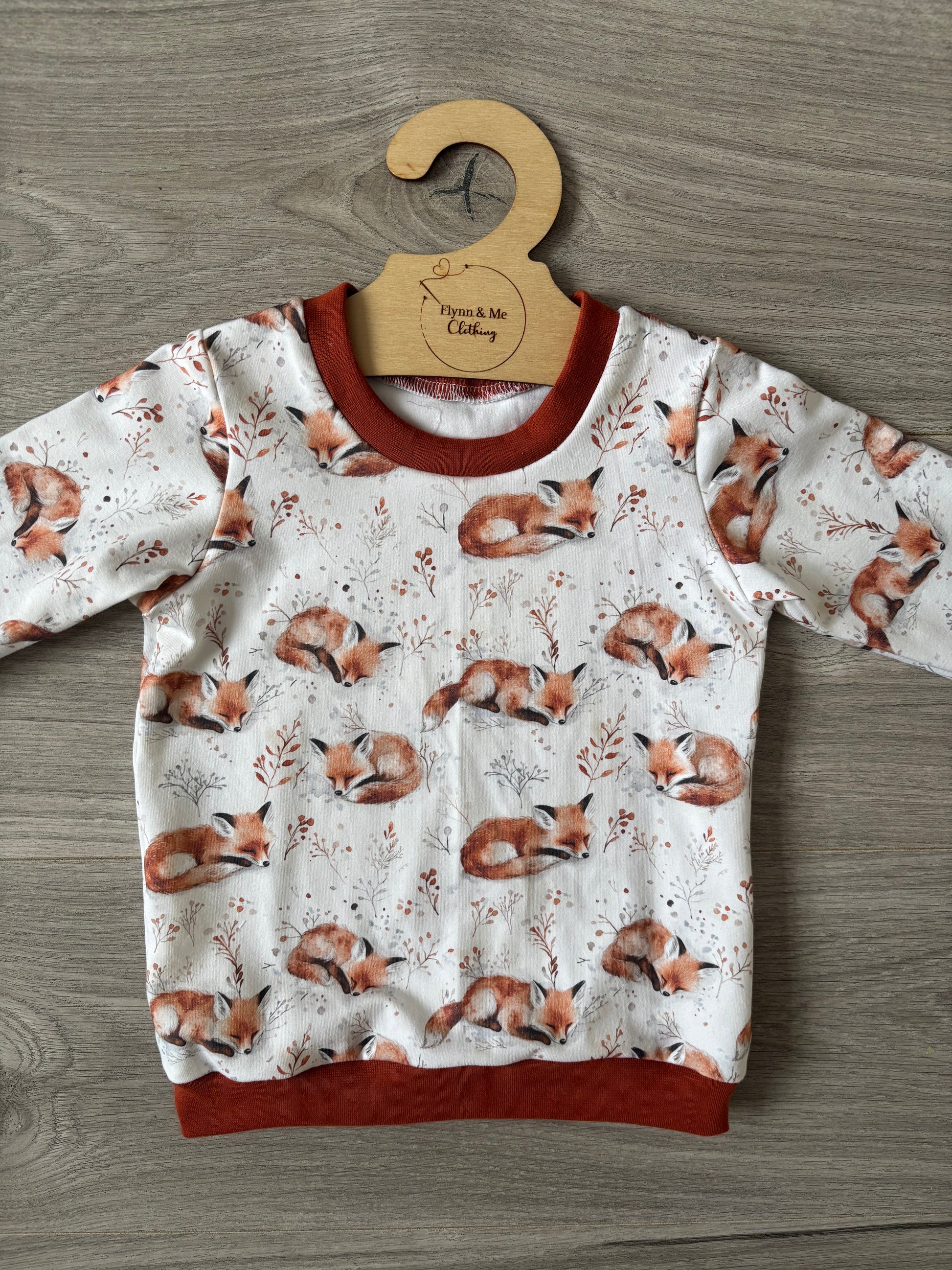 Our top in Slumbering Fox is full of woodland calm — featuring a curled-up fox nestled among soft, wintry tones. With its peaceful, neutral palette, this print is perfect for little ones who love quiet cuddles, lazy mornings, and the magic of slow winter days in the countryside.