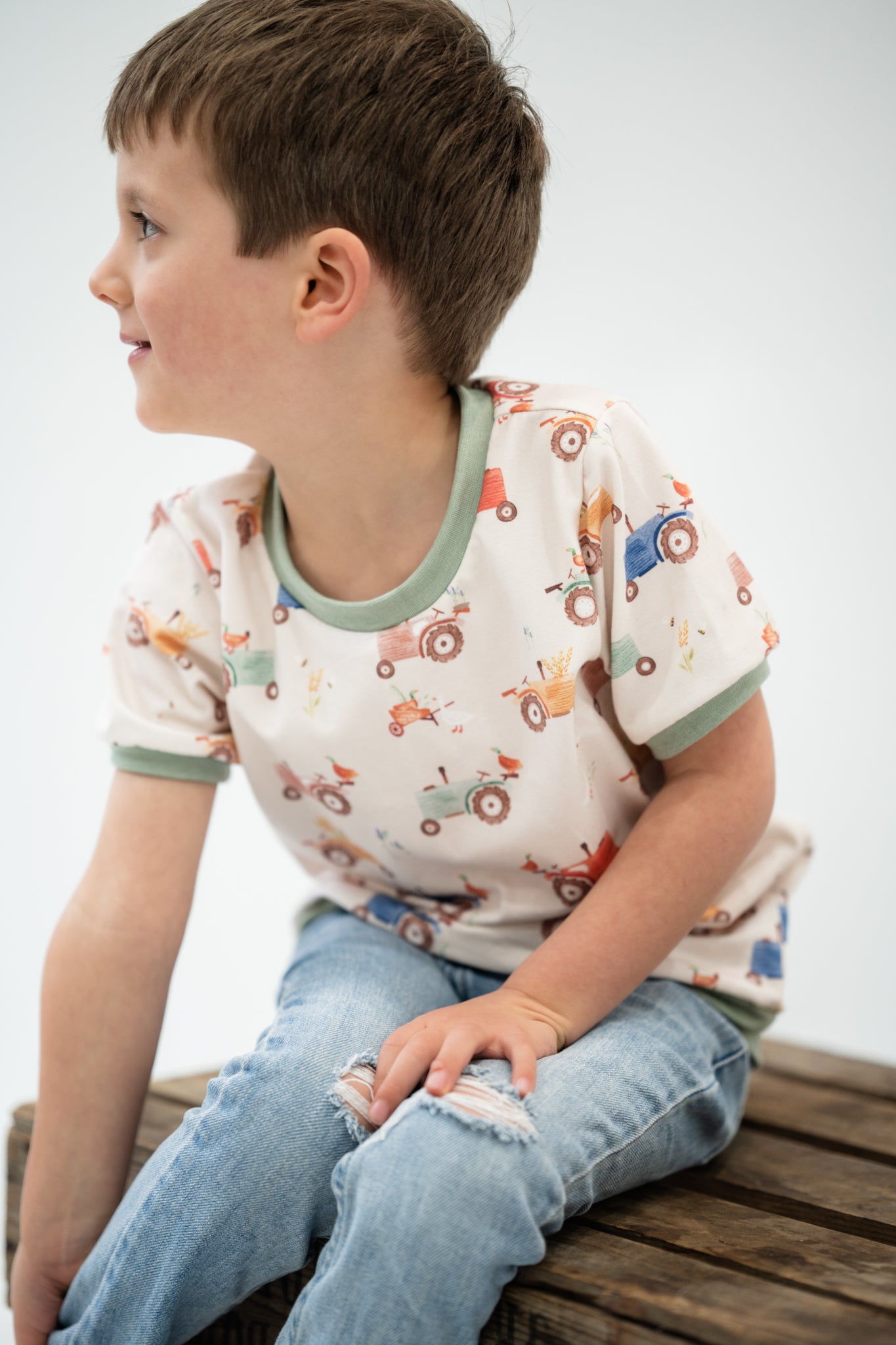 Working At The Quack Of Dawn is a minimalistic, classic farmyard design - perfect for those who love tractors and the countryside.